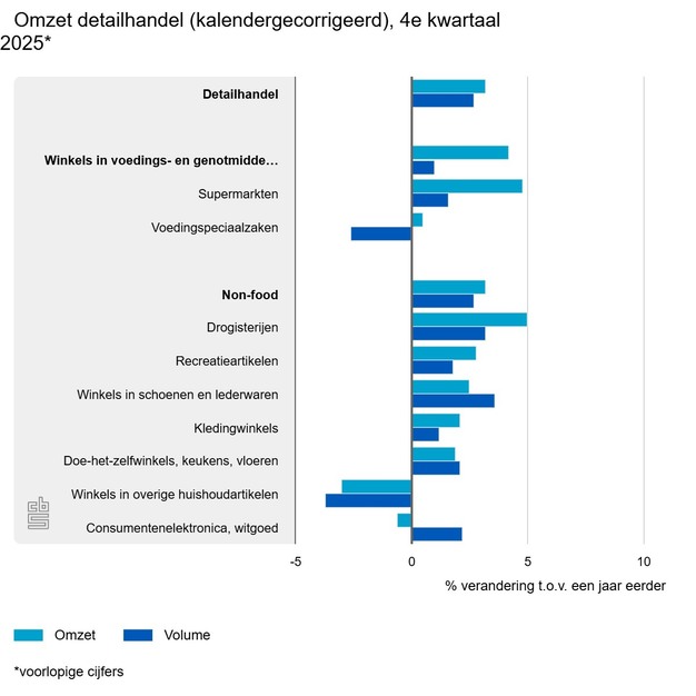 In het laatste kwartaal van 2025 draaiden winkels in voeding- en genotmiddelen 4,2 procent meer omzet dan een jaar eerder. De omzet van supermarkten stijgt met 4,8 procent. De omzet van voedingsspeciaalzaken zoals slagerijen en groentewinkels, stijgt met 0,5 procent. Tegelijkertijd stijgen de prijzen. De volumeontwikkeling binnen de supermarktbranche is 1,6 procent, bij voedingsspeciaalzaken is dit -2,6 procent. De cijfers zijn gecorrigeerd voor kalendereffecten.