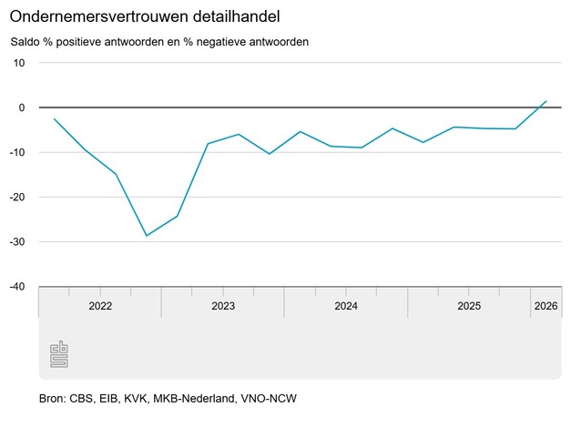 Het ondernemersvertrouwen van de detailhandel is gestegen en komt aan het begin van het eerste kwartaal van 2026 uit op 1,4. Daarmee is het sentiment voor het eerst in ruim vier jaar weer positief. Ondernemers zijn positiever over de verwachting van het economisch klimaat (+2,2), dan over de ontwikkeling van het economisch klimaat (+0,6). Dit was een kwartaal eerder ook zo.