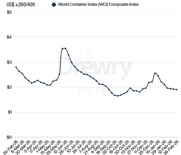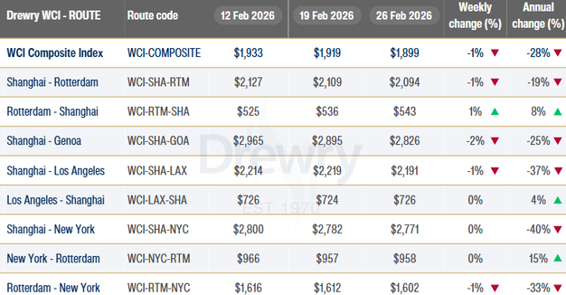 De World Container Index (WCI) van Drewry, een wekelijkse index die de gemiddelde spotprijzen weergeeft voor het vervoer van een 40-voets container op belangrijke mondiale zeevaartroutes, is in de week van 27 februari met 1% gedaald ot $1.899 per 40ft container. Dit is de derde week op rij dat de prijs per container met 1% daalt.