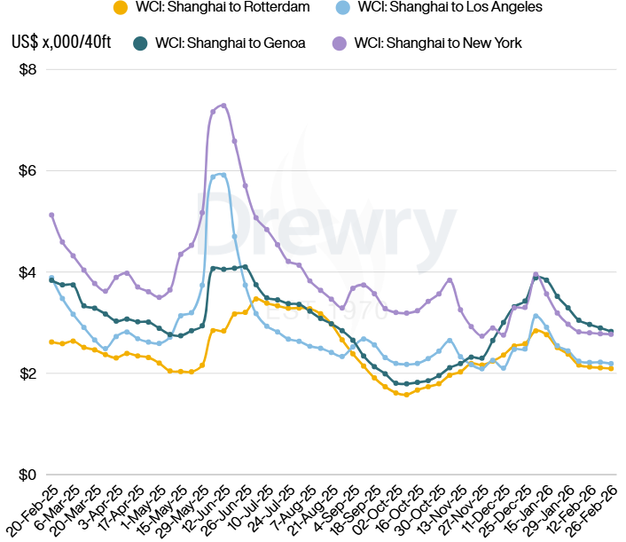 De spotprijzen voor containervervoer tussen Azië en Europa blijven onder druk staan. Op de route van Shanghai naar Rotterdam daalden de tarieven met 1% tot $2.094 per 40ft-container, terwijl de route naar Genoa 2% verloor en uitkwam op $2.826. Hoewel het volume doorgaans in maart herstelt door de heropening van fabrieken in Azië, wordt verwacht dat de tarieven onder druk blijven door het toenemende aanbod van scheepscapaciteit.