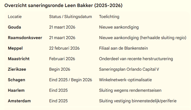 Met het vertrek uit Gouda en de herhaalde sluiting in de regio Raamsdonksveer - waar de keten al eerder onder vuur lag - wordt de kaart van Leen Bakker in Nederland steeds leger. De sluitingen maken deel uit van de herstructurering die noodzakelijk is onder de nieuwe eigenaar, investeringsmaatschappij Orlando Capital V.
