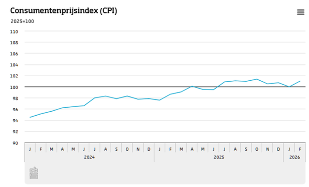 Vanaf 2026 zijn de CPI en de HICP over op een nieuw basisjaar, van 2015=100 naar 2025=100. Meer informatie over de overgang staat in het methodedocument 'De consumentenprijsindex vanaf 2026'.