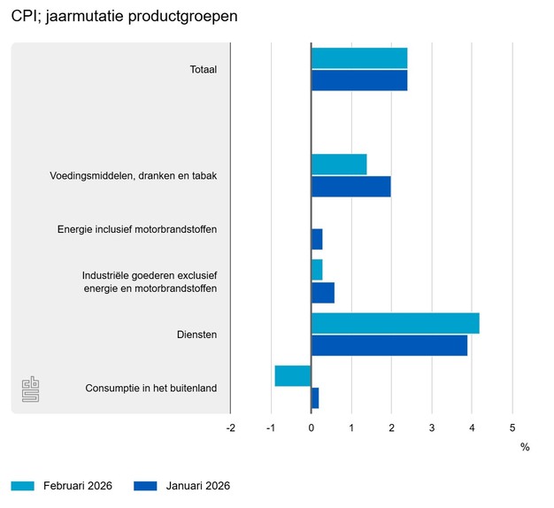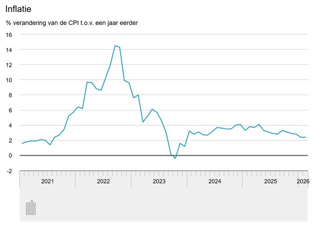 De inflatie in februari 2026 was 2,4 procent bij de snelle raming, meldt het Centraal Bureau voor de Statistiek (CBS). Deze raming is berekend op basis van nog onvolledige brongegevens. In januari 2026 was de inflatie ook 2,4 procent.