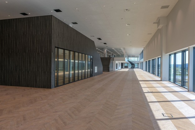 Per ruimte is gekozen voor een specifieke vloeroplossing. In werk- en kantoorruimtes zijn tapijttegels toegepast met het oog op comfort en akoestiek. PVC-stroken in verschillende legpatronen zorgen voor een eigentijdse uitstraling, terwijl in functionele zones is gekozen voor PVC-tegelvloeren. Op plaatsen waar extra grip noodzakelijk is, zijn veiligheidsvloeren aangebracht. Entrees zijn voorzien van schoonloopzones ter bescherming van de binnenvloeren en ter beperking van onderhoud. Ook tribunes en trappen zijn duurzaam afgewerkt.