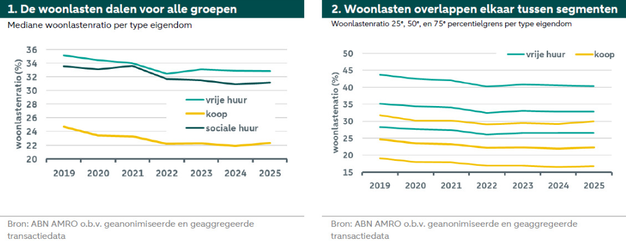 De zogeheten woonlastenratio, het deel van het inkomen dat aan wonen wordt besteed, laat zien dat huiseigenaren gemiddeld relatief minder kwijt zijn dan huurders. Voor kopers met een hypotheek daalde de mediane ratio van 24,7 procent in 2019 naar 22,3 procent in 2025. Bij huurders ging deze in dezelfde periode van 33,9 naar 31,5 procent.