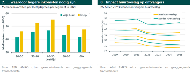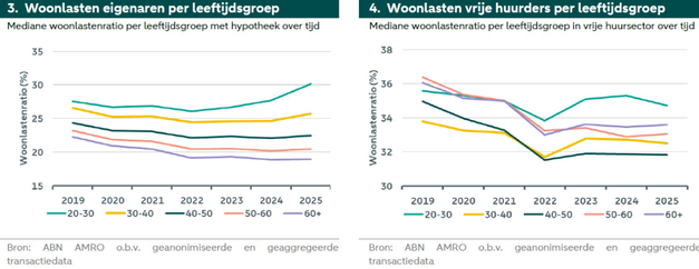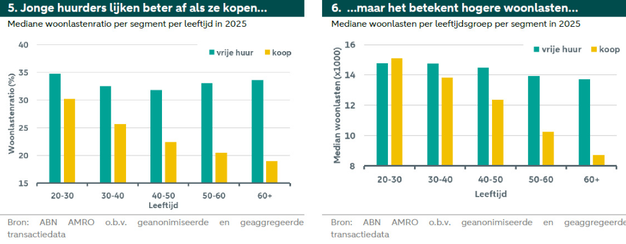 De analyse laat verder zien dat inkomensverschillen een belangrijke rol spelen. Kopers hebben gemiddeld hogere inkomens, waardoor hun woonlastenratio lager uitvalt, ondanks hogere absolute woonkosten. Bij jonge huishoudens liggen de verhoudingen dichter bij elkaar: starters met een koopwoning en jonge huurders in de vrije sector besteden ongeveer een vergelijkbaar deel van hun inkomen aan wonen.