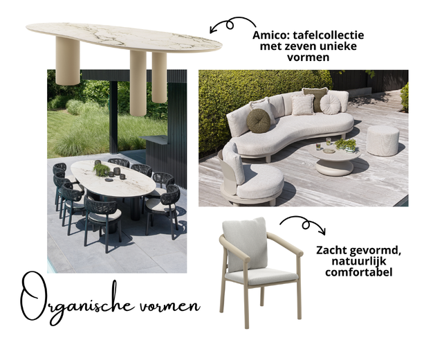 Persoonlijke buitenruimtes met vloeiende, natuurlijke lijnen vervangen standaardopstellingen. De Amico-collectie biedt diverse tafelvormen, keramische bladen en aluminium frames in meerdere kleuren, waardoor combinaties voor dining-, low-dining- of loungetafels volledig naar wens samen te stellen zijn.