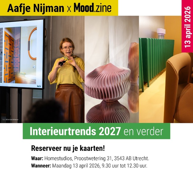 Trendwatcher Aafje Nijman bundelt voor 2027 haar krachten met interieurmagazine Mood.zine om de belangrijkste interieurtrends van het komende seizoen te presenteren. Op maandag 13 april verzorgt zij een lezing in Homestudios Utrecht, gericht op interieurprofessionals, retailers en ontwerpers die hun collecties en concepten willen afstemmen op actuele ontwikkelingen.
