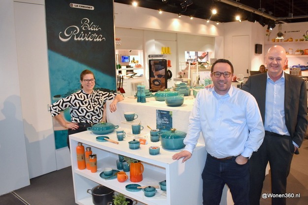 © Leo Elenbaas | Wonen360.nlMerel Uiterwijk, Richard-Julien Trip en Marcel Kesting poseren bij de nieuwe Le Creuset-collectie Bleu Riviera.