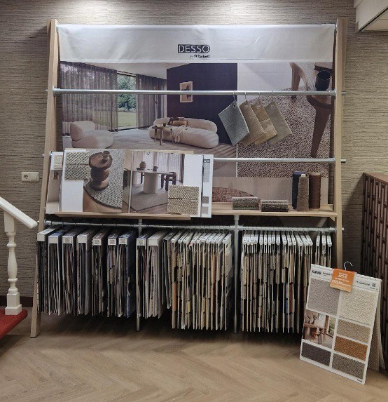 De presentatie combineert overzichtelijke stalenhangers met sfeervolle banners die laten zien hoe DESSO tapijt of een vloerkleed op maat een ruimte tot leven brengt. Klanten ervaren zo direct de structuur, uitstraling en mogelijkheden van de collectie én krijgen een realistisch beeld van het eindresultaat in hun interieur.