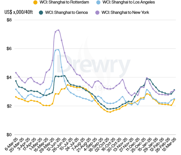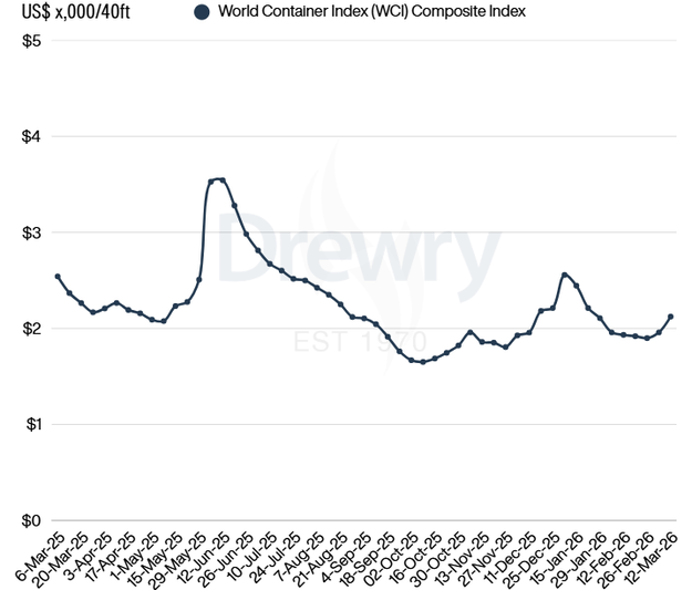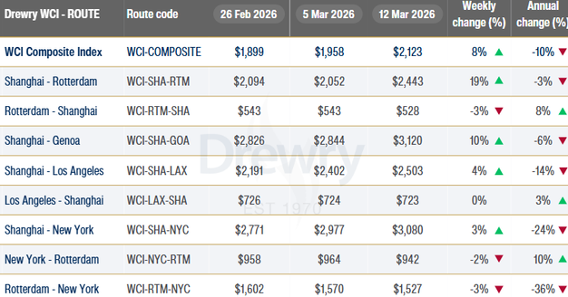 De World Container Index (WCI) van Drewry, een wekelijkse index die de gemiddelde spotprijzen weergeeft voor het vervoer van een 40-voets container op belangrijke mondiale zeevaartroutes, is in de week van 13 maart met 8% gestegen tot $2.123 per 40ft container.