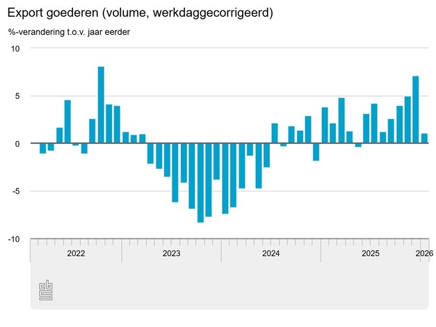 Het volume (werkdaggecorrigeerd) van de goederenexport was in januari 1,1 procent groter dan in januari 2025, volgens voorlopige cijfers van het Centraal Bureau voor de Statistiek (CBS). Bedrijven hebben vooral meer delfstoffen en textiel en kleding uitgevoerd. De uitvoer van voedings- en genotmiddelen en van machines was echter lager. Het volume van de goederenimport was in januari 5,0 procent groter dan in januari 2025. Er zijn onder andere meer delfstoffen, elektrotechnische machines, transportmiddelen en machines ingevoerd.