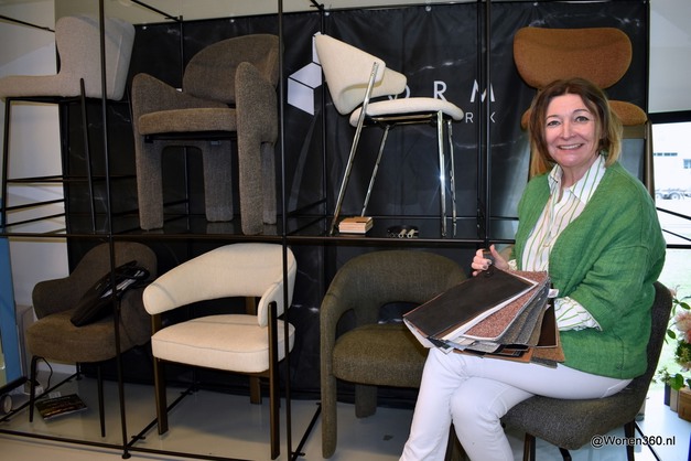 Bij Dan Form zagen we een duidelijke verschuiving in vormentaal. Martine van der Haegen (zie foto) wees op de nieuwe stoelcollectie: "Helemaal 2025/2026 zijn de brede vormen, draaibare stoelen en het gebruik van veel bouclé stoffen. Ook een opvallende trend: gestoffeerde poten die doorlopen tot aan de grond."
