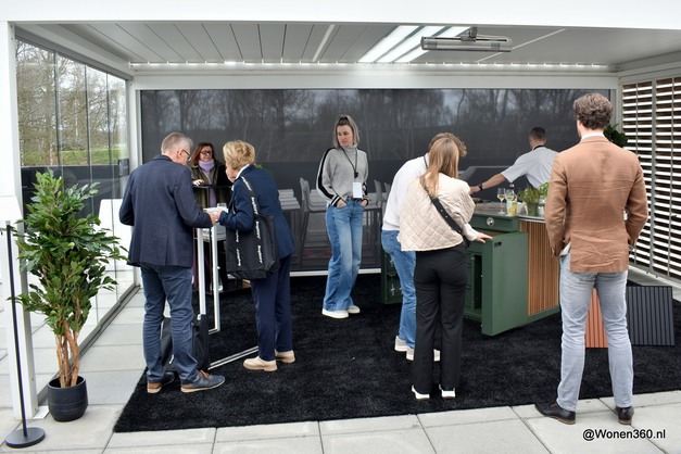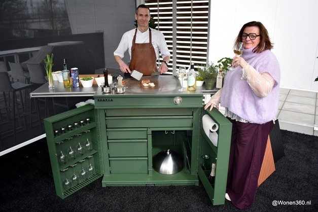 Buiten op het terras van de eerste verdieping was de focus gericht op het buitenleven. Hedwig Verwerft (zie foto hierboven, met kok Jelle Bertels) van de P&G Group presenteerde de nieuwe mobiele buitenkeuken Spatia. Deze compacte unit, inclusief de innovatieve Qooking Table waarmee zowel gegrild als op inductie gekookt kan worden, is bedoeld voor zowel de keukenhandel, horeca als de high-end particulier. "We hebben een zeer goede maandag gehad en de feedback op dit concept is overweldigend," aldus Verwerft.