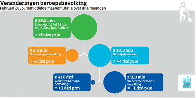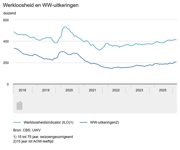 in februari waren er 416 duizend werklozen. Het aantal werklozen nam de afgelopen drie maanden toe met gemiddeld 3 duizend per maand. Hiermee was 4,1 procent van de beroepsbevolking van 15 tot 75 jaar werkloos. Ook het aantal mensen met betaald werk nam de afgelopen drie maanden toe met gemiddeld 1 duizend per maand. Dit meldt het Centraal Bureau voor de Statistiek (CBS) op basis van nieuwe cijfers. UWV registreerde eind februari 205 duizend lopende WW-uitkeringen.