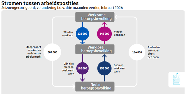 Er zijn ook twee stromen waardoor de werkloosheid stijgt. Dit zijn werkenden die hun baan verliezen (121 duizend) en mensen die zich eerder niet aanboden op de arbeidsmarkt, maar nu op zoek zijn naar werk (136 duizend). Als ze niet meteen werk vinden, worden ze onderdeel van de werkloze beroepsbevolking. Hierdoor waren er in februari 257 duizend personen werkloos die dat drie maanden eerder nog niet waren. Zowel de instroom in werkloosheid als de uitstroom ligt hoger dan een jaar geleden.