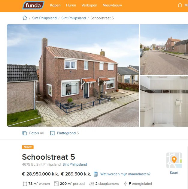 Wie doorklikte, ontdekte al snel dat het om een gewone twee-onder-een-kapwoning ging aan de Schoolstraat, met zes zonnepanelen, een zonnige tuin en voorzieningen dichtbij. Al snel werd duidelijk dat het om een foutje ging: twee extra nullen waren per ongeluk toegevoegd. Woensdagochtend is de vraagprijs gecorrigeerd naar het juiste bedrag van 289.500 euro. Het systeem van Funda laat echter de oorspronkelijke vraagprijs nog enkele uren zien, wat voor verwarring zorgde.