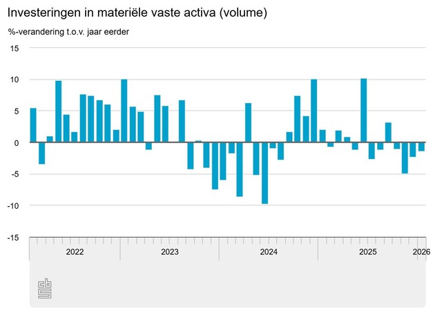 In januari 2026 was het volume van de investeringen in materiële vaste activa 1,4 procent kleiner dan een jaar eerder, meldt het Centraal Bureau voor de Statistiek (CBS). Een maand eerder bedroeg de krimp 2,3 procent, Er is vooral minder geïnvesteerd in gebouwen, personenauto's en infrastructuur. De investeringen in vliegtuigen waren groter dan in januari 2025.