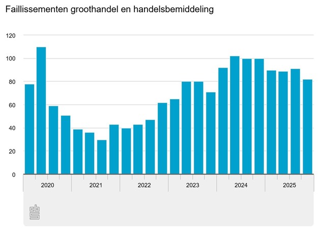 In 2025 zijn er in totaal 352 bedrijven failliet verklaard, 42 bedrijven minder dan in 2024. In het vierde kwartaal zijn 82 bedrijven in de groothandel en handelsbemiddeling failliet verklaard.