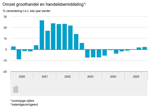 De omzet van de groothandel en handelsbemiddeling is 0,9 procent hoger in 2025 dan een jaar eerder. In het vierde kwartaal werd er 2,5 procent meer omgezet dan in hetzelfde kwartaal een jaar eerder. Daarmee is de omzet voor het derde kwartaal op rij hoger dan in dezelfde periode van 2024. Dit meldt het Centraal Bureau voor de Statistiek op basis van nieuwe cijfers over de groothandel.