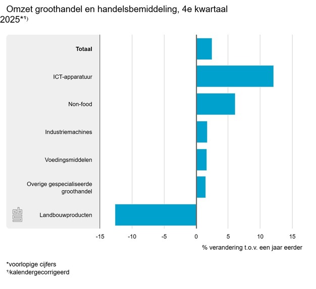 Ook in het vierde kwartaal van 2025 hebben bijna alle groothandelsbranches meer omzet gehaald dan in dezelfde periode een jaar eerder. De omzet van de groothandel in ICT-apparatuur was 12,1 procent hoger. Ook de deelbranches non-food (6,1 procent) en voedingsmiddelen (1,7 procent) boekten meer omzet. Alleen de omzet van de groothandel in landbouwproducten was 12,6 procent lager.