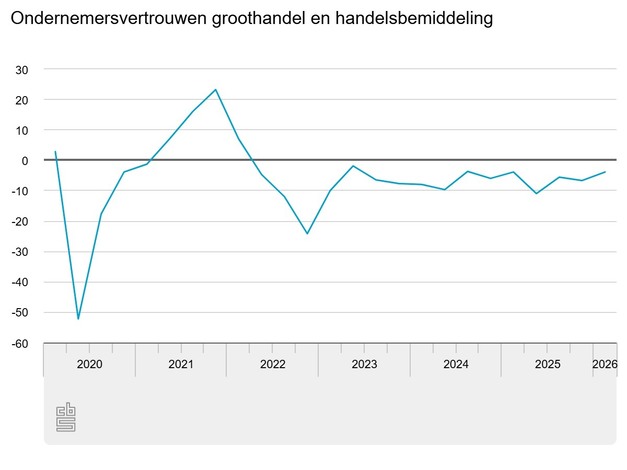 Het ondernemersvertrouwen is in de groothandel en handelsbemiddeling met een score van -3,9 negatief aan het begin van het eerste kwartaal van 2026. Dat is iets positiever dan een kwartaal eerder. Daarmee is voor het zestiende opeenvolgende kwartaal sprake van een negatieve stemming in de branche.