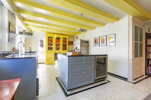 Het souterrain herbergt een ruime woonkeuken met Belgisch hardstenen werkblad en hoogwaardige inbouwapparatuur, waaronder een 6-pits fornuis, ovens, combimagnetron, vaatwasser, koel- en vriesapparatuur en een wijnklimaatkast. Openslaande deuren geven toegang tot een zonnig terras en een tuin waarvan een deel privé is.