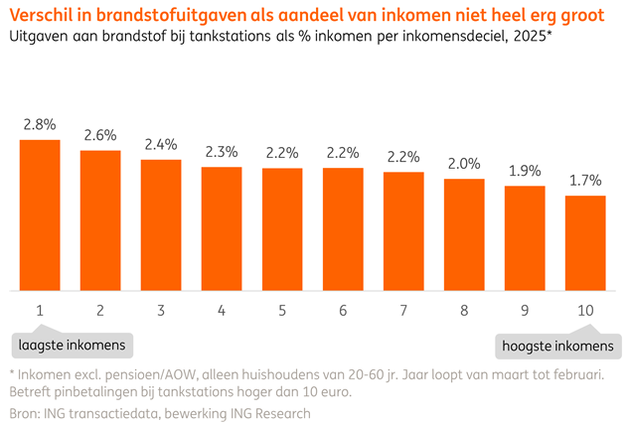 We zien dat hogere inkomens meer dan twee keer zoveel euro's uitgeven aan brandstof dan lagere inkomens doen. Dat komt vooral doordat een veel hoger percentage mensen van de hogere inkomensgroepen frequent tankt (37% in het laagste deciel en 69% in het hoogste). Veel mensen in lagere inkomensgroepen hebben geen auto. En wie wel een auto heeft, heeft vaak een kleinere auto en rekent naar verhouding dus minder af (bij de 10% laagste inkomens waren de brandstofkosten in 2025 naar schatting gemiddeld iets onder de 1000 euro en bij hoogste inkomens iets meer dan 2000 euro). Dat drukt ook het percentage van het inkomen dat mensen in lagere inkomensgroepen gemiddeld aan brandstof besteden. Daardoor is het verschil in het percentage dat de verschillende inkomensgroepen aan brandstof besteden niet erg groot. Dat betekent ook dat lagere brandstofaccijnzen in grote mate toekomen aan mensen in hogere inkomensgroepen.