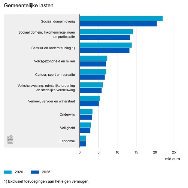 Nederlandse gemeenten hebben dit jaar 84,6 miljard euro aan lasten begroot voor 2026. Dat is 5,8 procent meer dan in de begrotingen voor 2025. Deze toename is kleiner dan in de drie jaren daarvoor. Dit meldt het Centraal Bureau voor de Statistiek (CBS) op basis van de gemeentebegrotingen van 2026.