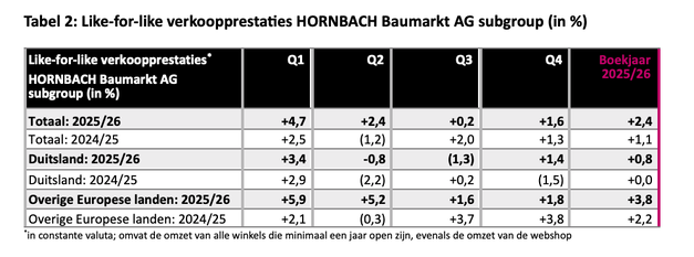 Internationaal groeide Hornbach door, met een omzetstijging van 5,5% in de acht overige landen, waardoor het internationale aandeel in de totale omzet op 53,2% uitkomt. In Duitsland steeg de omzet met 2,3% tot 2,85 miljard euro. Per 28 februari 2026 exploiteerde Hornbach Baumarkt AG 173 vestigingen in tien landen.