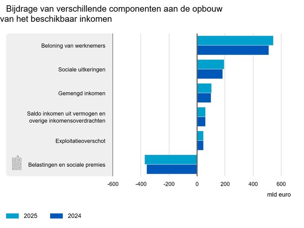 Het inkomen van zowel werknemers als zelfstandigen lag in 2025 hoger dan in 2024. De totale beloning van werknemers groeide met 6,4 procent. Het aantal banen van werknemers groeide met 1,5 procent, terwijl de cao-lonen 5,0 procent hoger waren. Het gemengd inkomen lag 0,8 procent hoger.