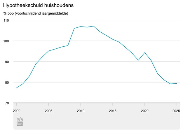 De woninghypotheekschuld nam in 2025 toe met 48,1 miljard euro vergeleken met een jaar eerder. De hypotheekschuld liep hiermee sterker op dan vorig jaar. De huizenprijzen stegen en er werden meer woningen verkocht. Doordat de economie nominaal minder hard groeide dan de schuldtoename, nam de hypotheekschuld als percentage van het bbp toe; van 79,2 procent in 2024 naar 79,4 procent in 2025.