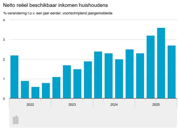 Het reëel beschikbaar inkomen van huishoudens is in 2025 met 2,7 procent gegroeid ten opzichte van een jaar eerder. De toename is vooral toe te schrijven aan een stijging van de beloning van werknemers, door hogere cao-lonen. De hypotheekschuld groeide met 48,1 miljard euro ten opzichte van een jaar eerder, naar 935,9 miljard euro. Dit meldt het Centraal Bureau voor de Statistiek op basis van nieuwe cijfers over de financiën van huishoudens.