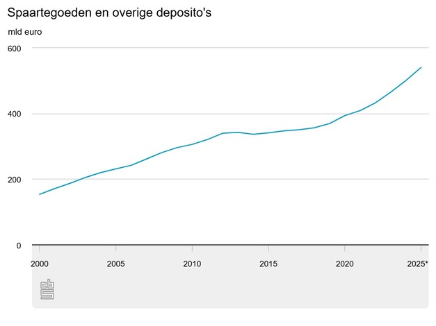 Huishoudens hadden eind 2025 ruim 540 miljard euro spaartegoeden en overige deposito's. Dat is een toename van 8,1 procent ten opzichte van een jaar eerder. De laatste keer dat de spaartegoeden relatief harder groeiden was in 2003, toen de tegoeden met 9,4 procent groeiden. Dit zijn de tegoeden van Nederlandse huishoudens bij binnen- en buitenlandse banken.