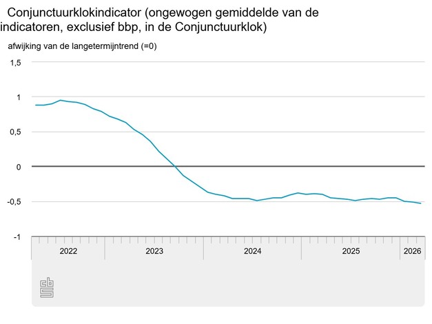 Het conjunctuurbeeld volgens de Conjunctuurklok van het Centraal Bureau voor de Statistiek (CBS) was in maart iets negatiever dan in februari. In de Conjunctuurklok van maart presteerden 9 van de 13 indicatoren slechter dan hun langjarige trend.