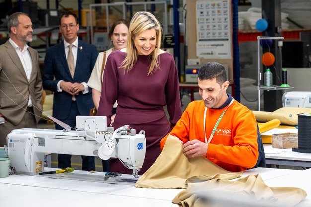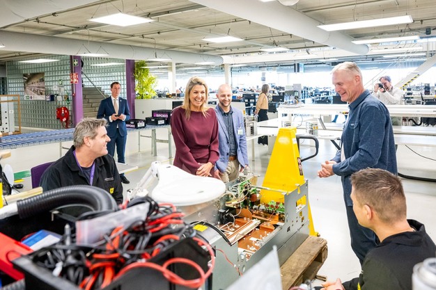 Bij kantoormeubelproducent Vepa werd de Koningin rondgeleid door de fabriek, waar de circulaire ambities van het bedrijf direct tastbaar werden. Directeur Arnoud van Spijk toonde hoe machines draaien op hernieuwbare principes en hoe restmaterialen worden getransformeerd tot nieuw designmeubilair.