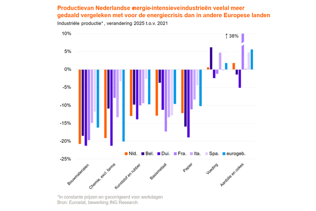 Minder energie-intensieve industrietakken, zoals farmacie en machine-industrie (waaronder chipmachines), hebben hun aandeel in de economie vergroot van 7,7% in 2021 naar 8,2% in 2025. Daarmee zijn zij nu belangrijker voor de toegevoegde waarde van Nederland dan de energie-intensieve industrie. Dit wijst op een structurele verandering in de Nederlandse industrie, die de economie minder afhankelijk maakt van energie-intensieve sectoren.