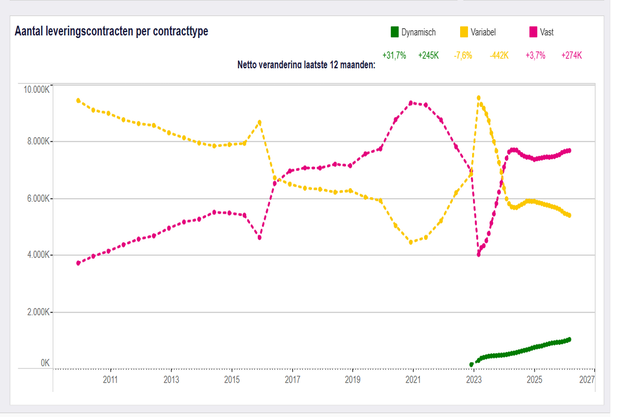 In maart 2026 heeft de Nederlandse dynamische energiemarkt een belangrijke mijlpaal bereikt: het aantal huishoudelijke aansluitingen op dynamische energiecontracten overschreed de één miljoen, blijkt uit gegevens van de ACM Energiemonitor, geanalyseerd door NextEnergy. Ongeveer 60% van deze aansluitingen betreft elektriciteit, terwijl 40% gas omvat.
