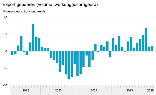 De Nederlandse goederenexport heeft in februari een gematigde groei laten zien, volgens voorlopige cijfers van het Centraal Bureau voor de Statistiek (CBS). "Het volume (werkdaggecorrigeerd) van de goederenexport was in februari 1,6 procent groter dan in februari 2025", meldt het CBS.
