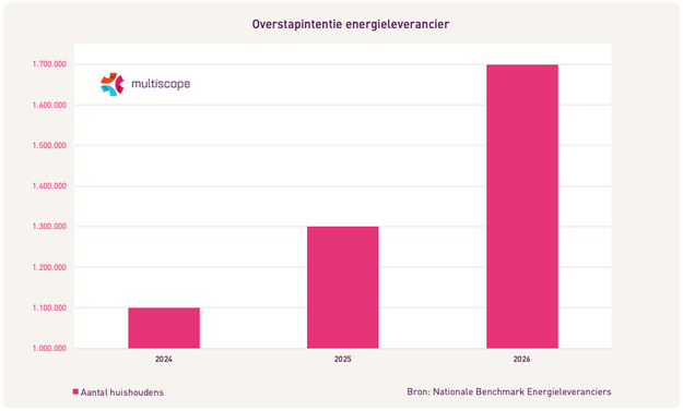 Een groeiend aantal Nederlandse huishoudens overweegt om van energieleverancier te wisselen. Uit de Nationale Benchmark Energieleveranciers van Multiscope, gebaseerd op onderzoek onder ruim 4.600 Nederlanders, blijkt dat naar verwachting 1,7 miljoen huishoudens in het komende jaar willen overstappen. Daarmee is sprake van een duidelijke stijging ten opzichte van 2024, toen dit aantal nog op 1,1 miljoen lag.