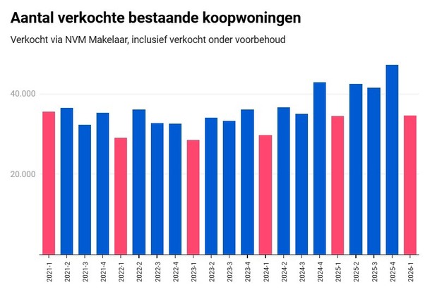 Het aantal verkopen in de bestaande bouw daalde dit kwartaal met 27% naar circa 34.600 woningen. Naast seizoensinvloeden (zoals winterweer dat fotografie en bezichtigingen bemoeilijkte) spelen de licht gestegen hypotheekrente en een dalend consumentenvertrouwen een rol. Kopers zijn afwachtend en nemen minder risico's. Toch is er geen sprake van een 'koude' markt: twee derde van de woningen wordt nog steeds boven de vraagprijs verkocht, al is de marge kleiner geworden (gemiddeld 3,7% boven de vraagprijs).