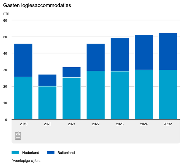 Het aantal buitenlandse gasten steeg met 5 procent naar 22,3 miljoen. Binnenlandse gasten kwamen uit op 29,9 miljoen, een lichte daling van 0,4 procent. Hotels blijven de belangrijkste accommodatievorm met 33,7 miljoen gasten, een toename van 2 procent. Kampeerterreinen laten de sterkste groei zien met een stijging van 9 procent naar 5,6 miljoen bezoekers, terwijl huisjesterreinen stabiel blijven met 11,4 miljoen gasten.