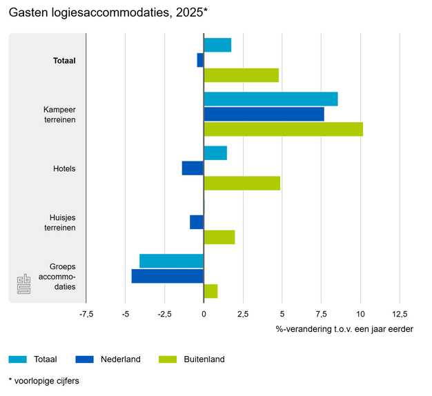 De groei van buitenlandse bezoekers is zichtbaar in alle typen accommodaties. Bij kampeerterreinen bedraagt deze stijging 10 procent. Ook binnenlandse kampeergasten nemen daar toe met 8 procent. In hotels daarentegen groeit het aantal buitenlandse gasten met 5 procent, terwijl het aantal Nederlandse hotelgasten met 1 procent daalt. In totaal verbleven 16,2 miljoen buitenlandse gasten in hotels, een toename van circa 760.000.