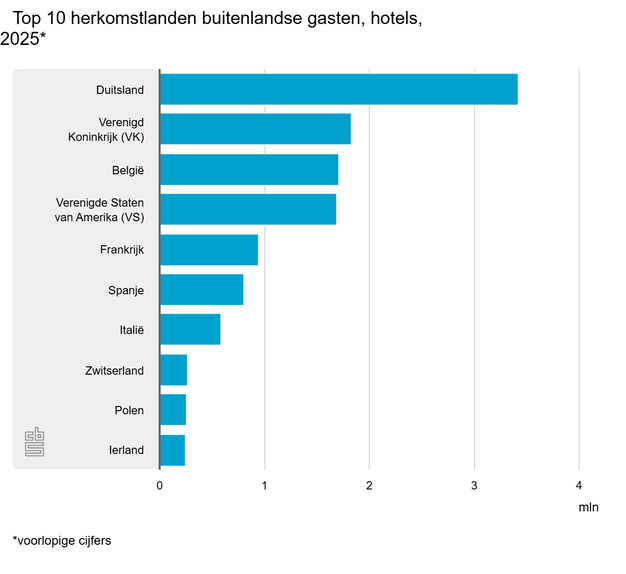 Opvallend is de herkomst van hotelgasten: Duitsland blijft de belangrijkste bronmarkt, gevolgd door groeiende aantallen bezoekers uit de Verenigde Staten en het Verenigd Koninkrijk.