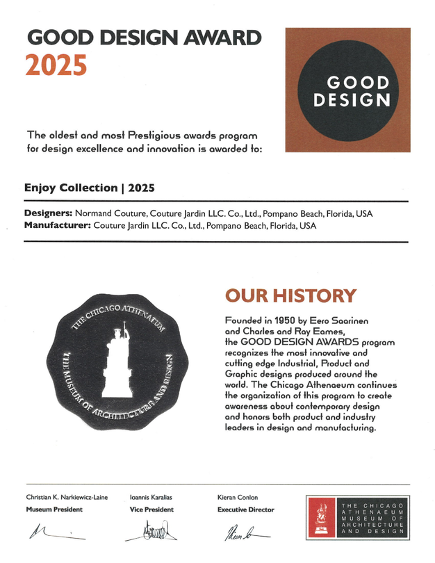 De ENJOY Collection van COUTURE Jardin is onderscheiden met de GOOD DESIGN Award 2025, zo bevestigen The Chicago Athenaeum: Museum of Architecture and Design en The European Centre for Architecture Art Design and Urban Studies.