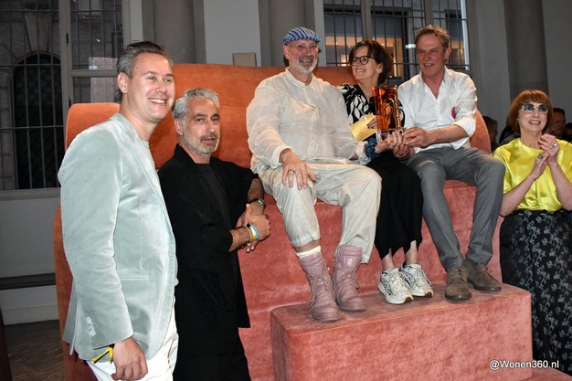 Na afloop gingen de winnaars en de juryleden op de foto, met v.l.n.r. Mark Timo (oprichter van De Interieur Club), Robin Sluijzer (interieur- en exterieurontwerper), Bert Timmermans (WorkingBert), Christine Boland (trendanalist), Eric Sloot (designer) en Nicole Uniquole (curator van Masterly).