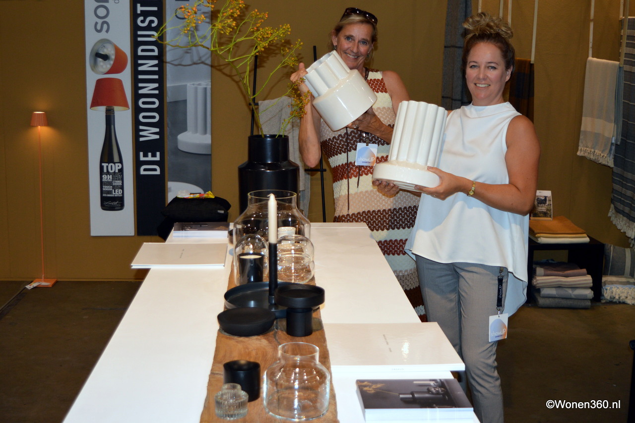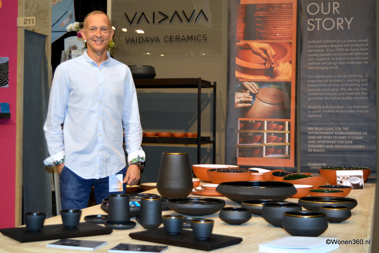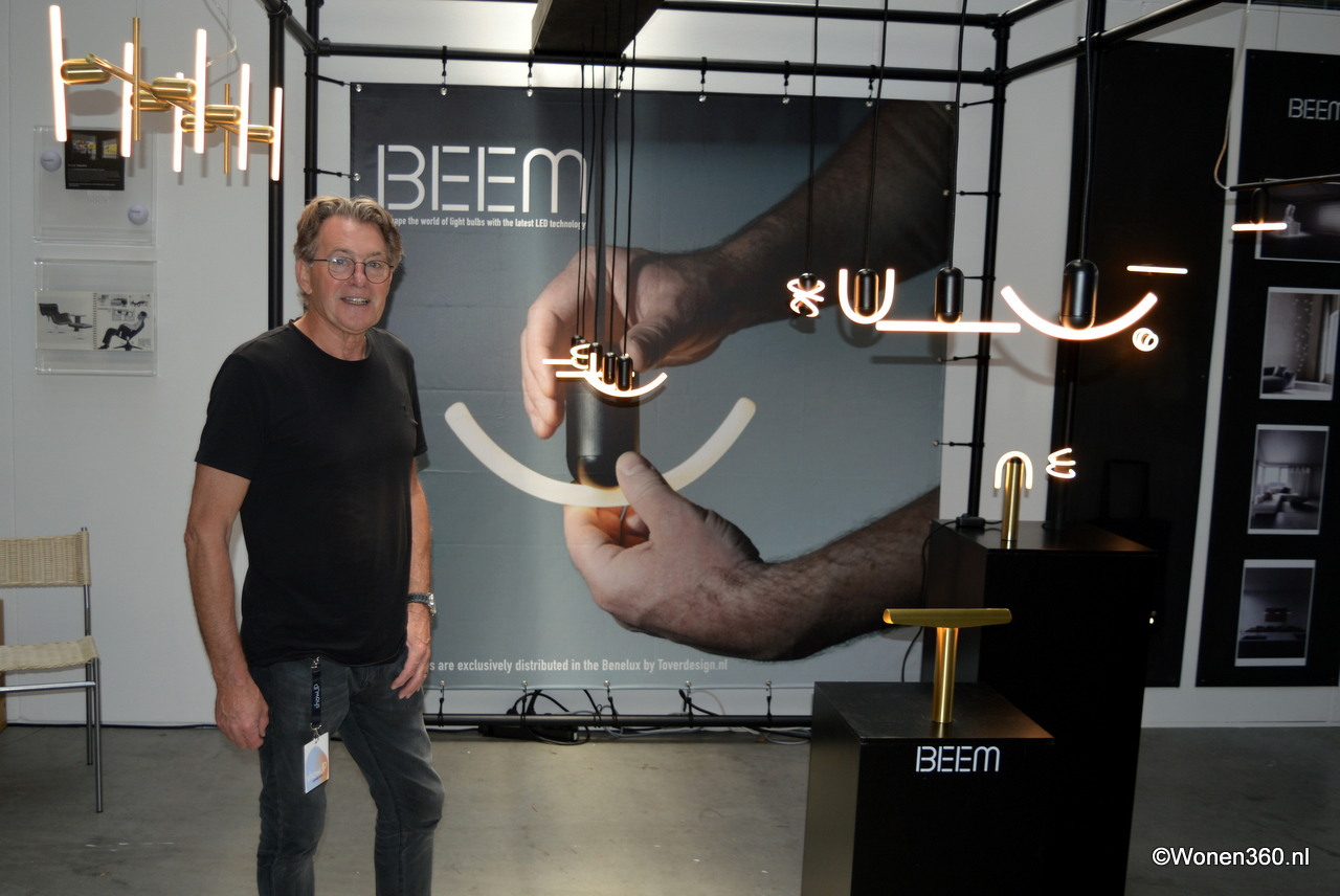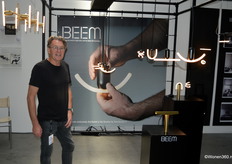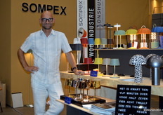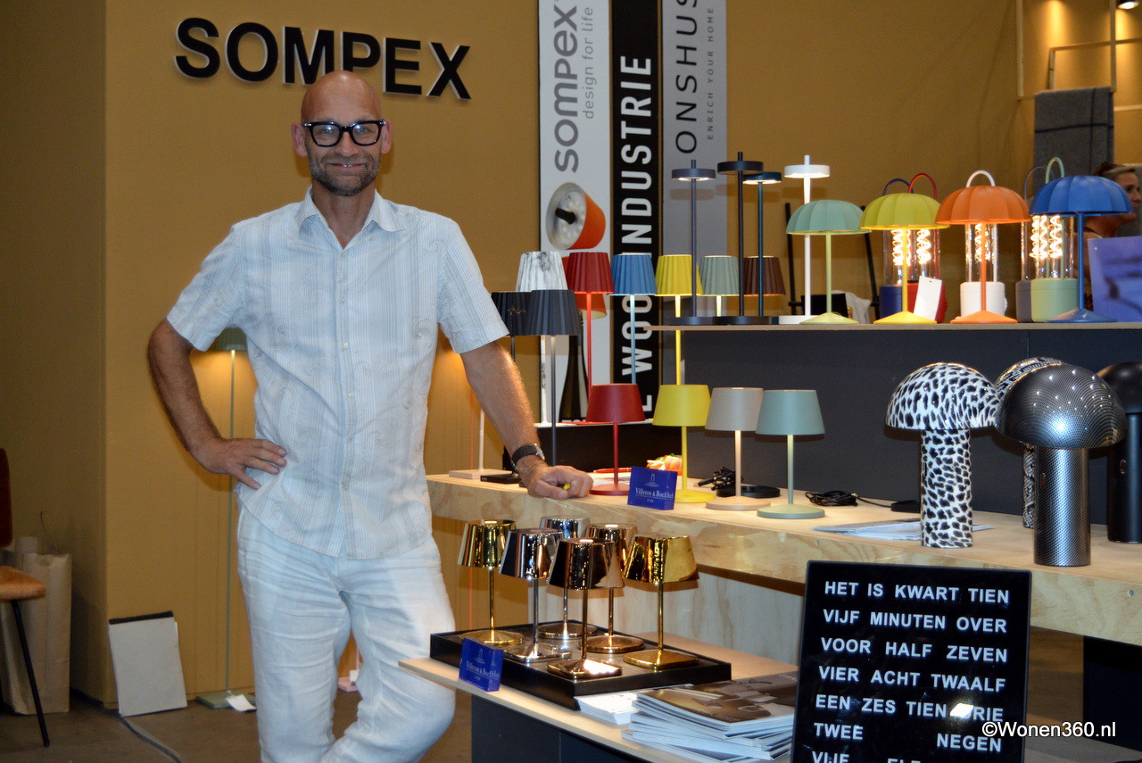 Ook Sompex stond op de gezamenlijke stand van een aantal exposanten uit De Woonindustrie. Robin Punt poseert naast de glanzende verlichtingscollectie die in samenwerking met Villeroy & Boch is gemaakt.