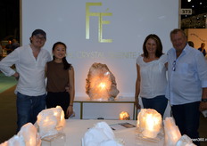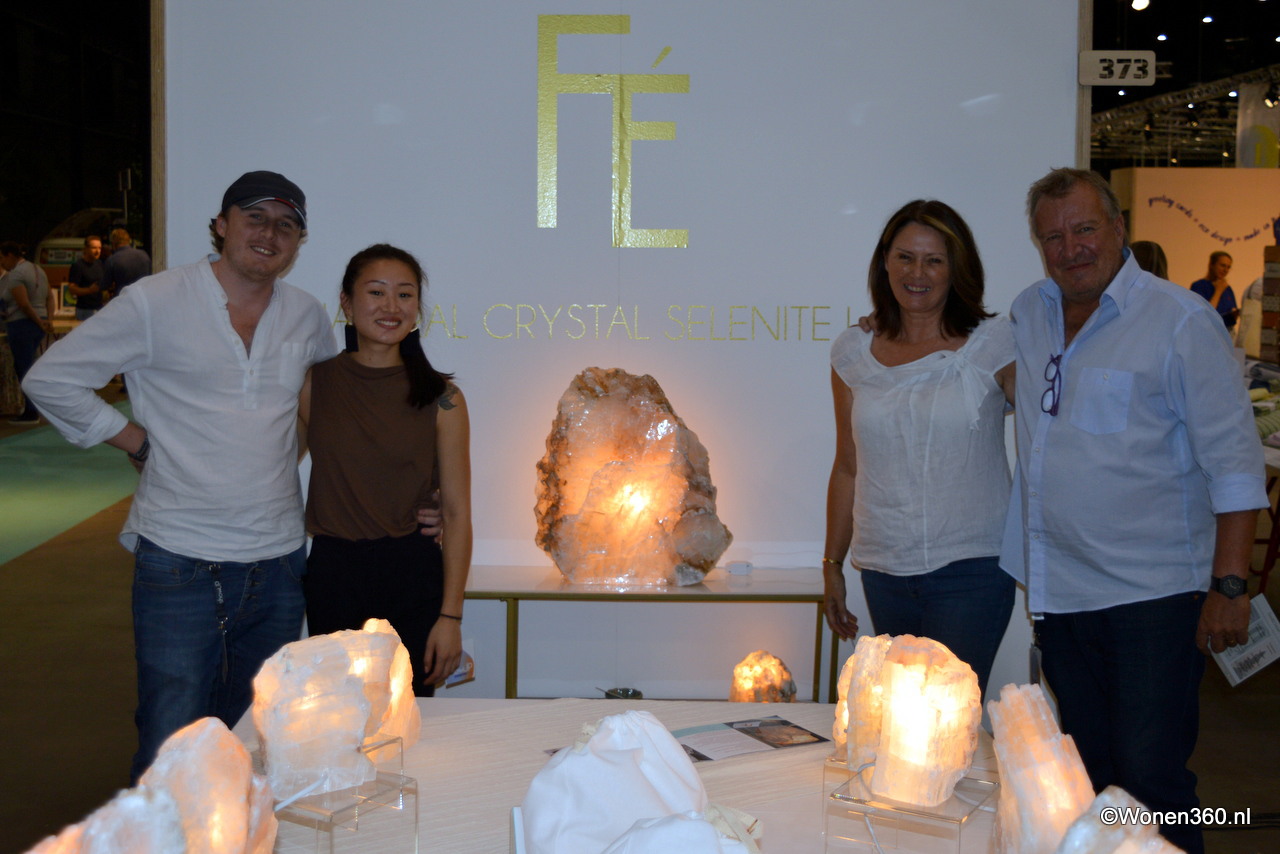 Pieter, Melissa, Marjolein en Paul van FÉ Quartz poseren naast de 'Mona Lisa onder de stenen'. De duurzame FÉ lampen zijn gemaakt van kristallen uit Mexico, rondom de magische Stille Oceaan.