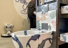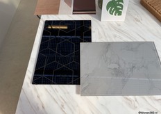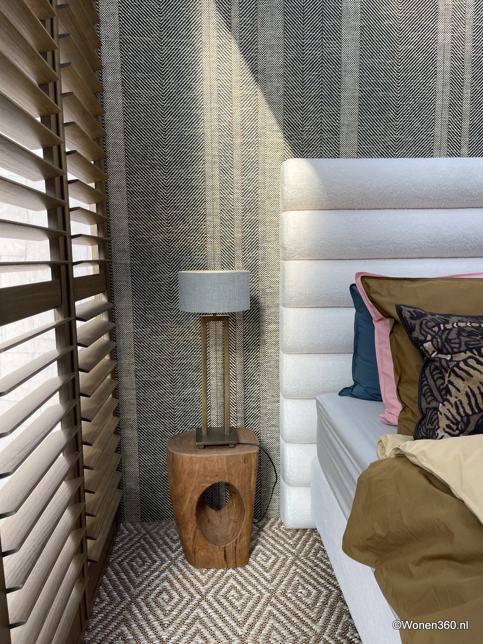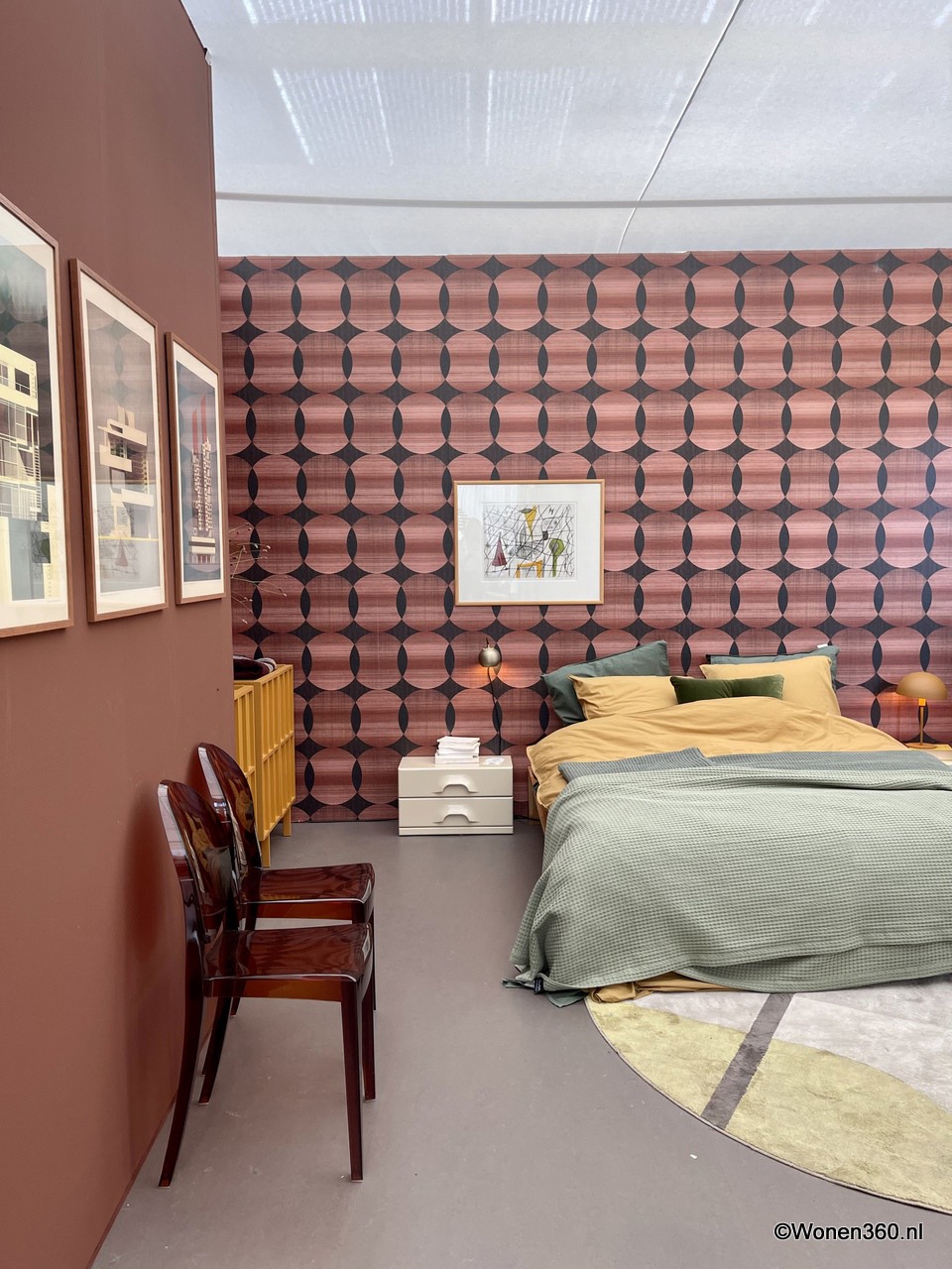 De wand was bekleed met behang uit de collectie Tribu by Omexio (Dessin Rythm, kleur TRU53) van Arte.