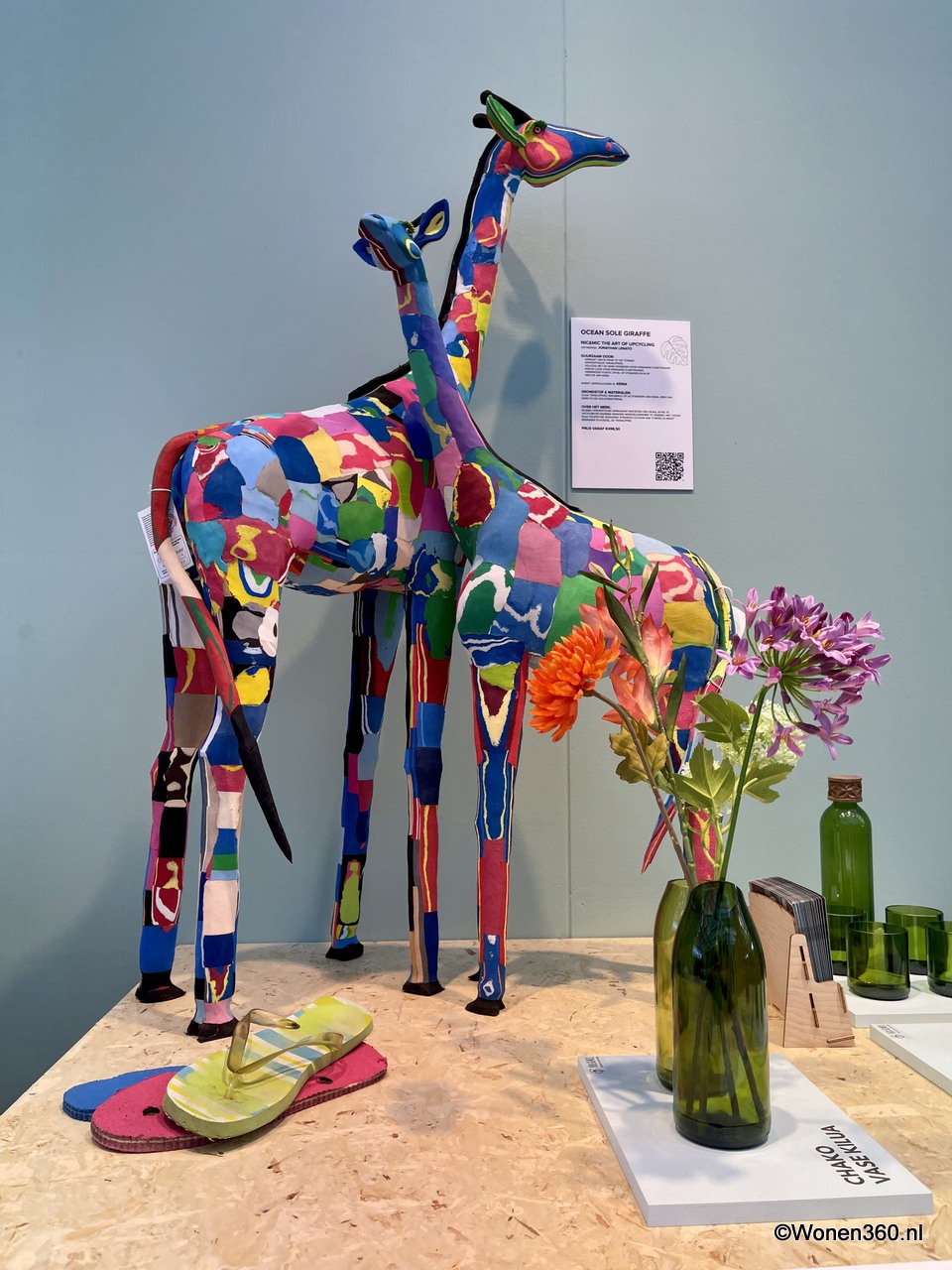 De giraffen zijn gemaakt van in Kenia op het strand aangespoelde teenslippers. Het merk ondersteunt Afrikaanse initiatieven om lokaal afval te upcyclen en daarmee gedegen werkgelegenheid te creëren.
